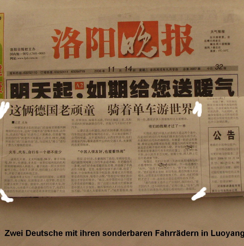 Morgens um 04.30 Uhr klingelt der Wecker. Um 06.00 Uhr sind wir am Einladen der Fahrräder. Dieses mal müssen wir nur einen Teil des Sitzes demontieren. Um 01.00 sind wir in unserer neuen Unterkunft (mit Internetanschluss im Zimmer). Am Nachmittag ein kleiner Besuch der Altstadt. Dabei überraschen uns mehrere Chinesen mit Kamera und Bleistift. Am 14.11.2006 erscheint einArtikel über uns in der Zeitung. Leider ohne Bilder und lesen können wir ihn auch nicht. Ein Abendessen gab es gratis. Auf der Fahrt mit den Rädern zu den Longman Grotten hören wir öfter "Degua" (Deutsche). Also haben wohl einige Leute den Artikel gelesen.