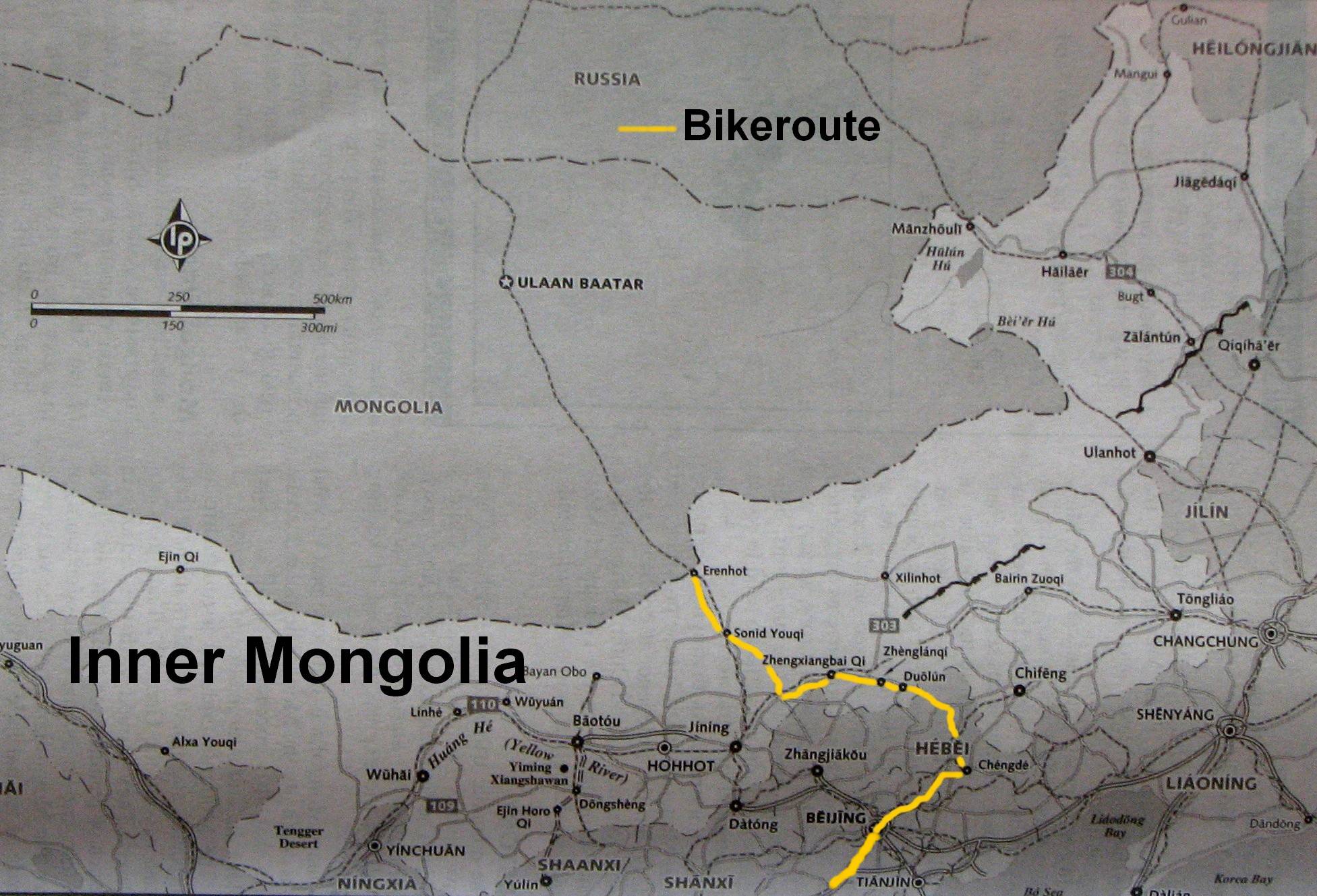 Nach unserer Rundreise durch die Mongolei mit dem Wagen hat uns der Fahrer an der Grenze zu China abgesetzt. Erster Schock, hier werden keine Euros getauscht. Mit der Scheckkarte haben wir dann Dollar erworben und umgetauscht in chinesisches Geld. Zweiter Schock, man kommt mit dem Fahrrad nicht ueber die Grenze. Unser Fahrer hat ein Taxi organisiert und dann ging es mit dem Wagen ueber die Grenze
